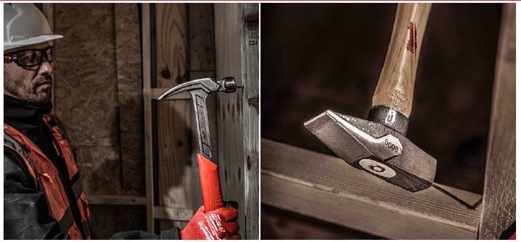 Dans cette gamme, MILWAUKEE® propose un marteau arrache-clous à griffe courbée disponible en 450 g et 570 g ainsi qu’un marteau rivoir disponible en 200 g, 300 g, 500 g, 800 g et 1 000 g (utile notamment pour le façonnage du métal).